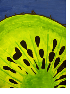 The painting shows a zoomed in image of a kiwi, emphasizing the seeds and inner part of the fruit