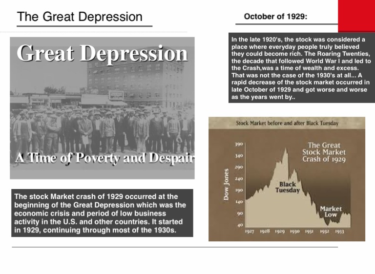 In the late 1920's, the stock was considered a place where everyday people truly believed they could become rich. The Roaring Twenties, the decade that followed World War I and led to the Crash,was a time of wealth and excess. That was not the case of the 1930's at all... A rapid decrease of the stock market occurred in late October of 1929 and got worse and worse as the years went by..