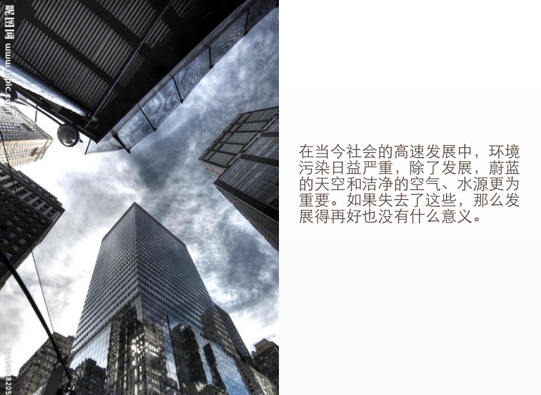 在当今社会的高速发展中,环境污染日益严重,除了发展,蔚蓝的天空和洁净的空气、水源更为重要。如