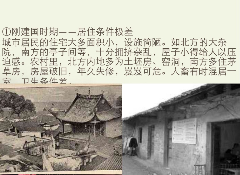 城市居民的住宅大多面积小,设施简陋。如北方的大杂院,南方的亭子间等,十分拥挤杂乱,屋子小得给人以压迫感。农村里,北方内地多为土坯房、窑洞,南方多住茅草房,房屋破旧,年久失修,岌岌可危。人畜有时混居一室,卫生条件差。