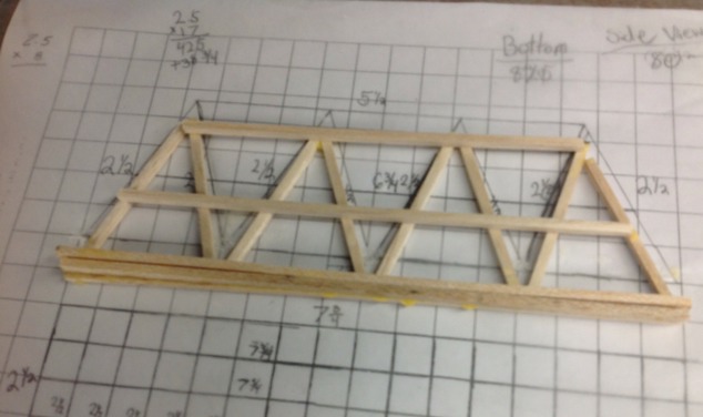 This is the first side of the balsa wood stick truss bridge design and I have used triangles to make it stronger.