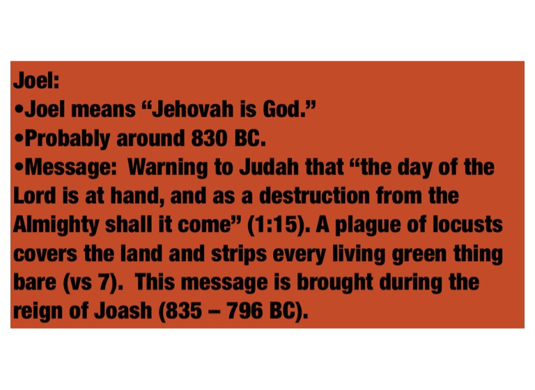 •Message: Warning to Judah that “the day of the Lord is at hand, and as a destruction from the Almighty shall it come” (1:15). A plague of locusts covers the land and strips every living green thing bare (vs 7). This message is brought during the reign of Joash (835 – 796 BC).