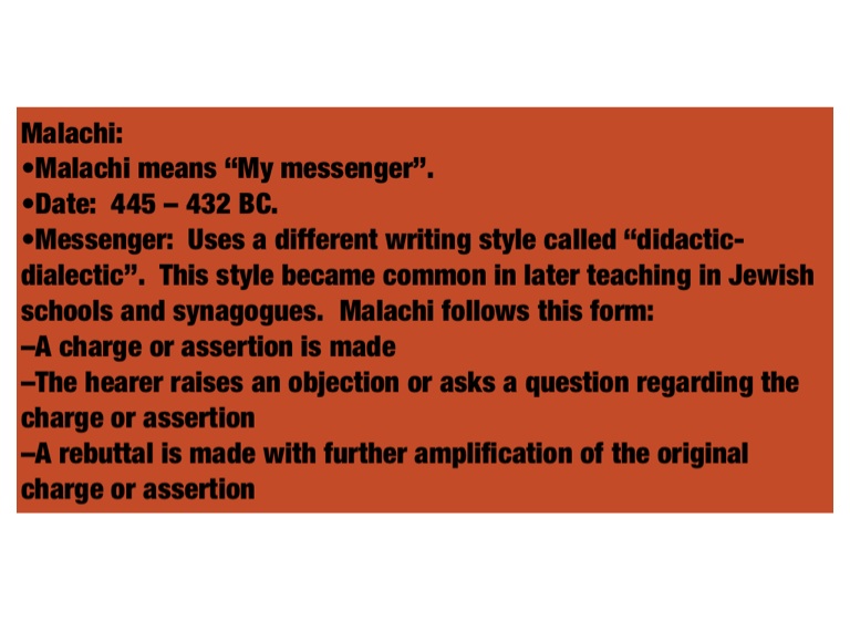 •Messenger: Uses a different writing style called “didactic-dialectic”. This style became common in later teaching in Jewish schools and synagogues. Malachi follows this form: