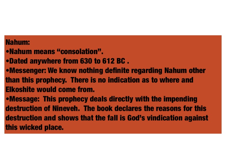 •Message: This prophecy deals directly with the impending destruction of Nineveh. The book declares the reasons for this destruction and shows that the fall is God’s vindication against this wicked place.