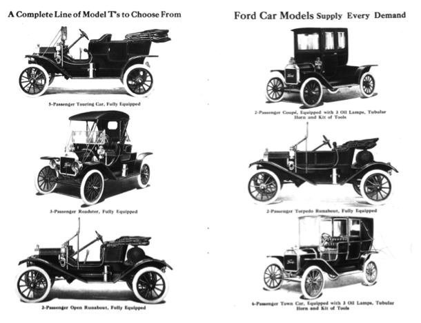 The Ford Model-T comes in a large variety of choices, from a touring car to a town car.