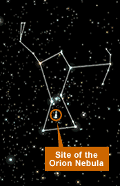 The Orion Nebula is located in the constellation Orion. It's about 1500 light years from Earth. As seen in a telescope, the angular measure of the Orion Nebula is 1 degree. This is twice the angular diameter of the full moon. The density of the nebula is about 600 atoms per cubic centimeter.