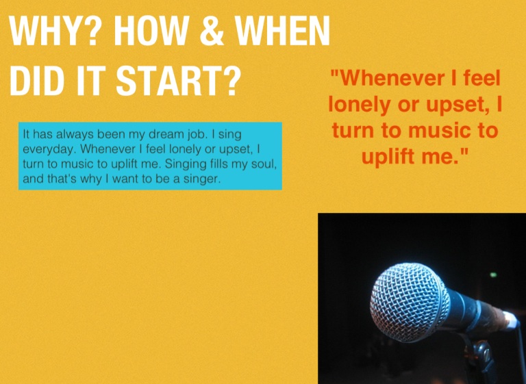 It has always been my dream job. I sing everyday. Whenever I feel lonely or upset, I turn to music to uplift me. Singing fills my soul, and that's why I want to be a singer.