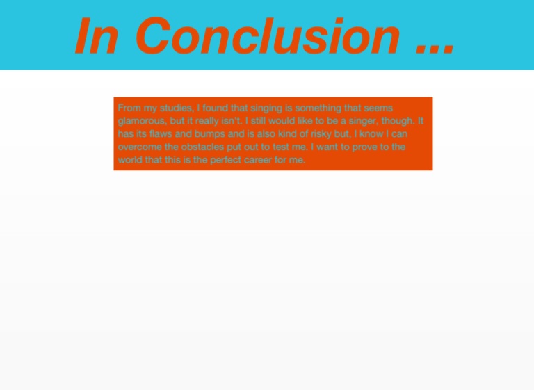 From my studies, I found that singing is something that seems glamorous, but it really isn't. I still would like to be a singer, though. It has its flaws and bumps and is also kind of risky but, I know I can overcome the obstacles put out to test me. I want to prove to the world that this is the perfect career for me.