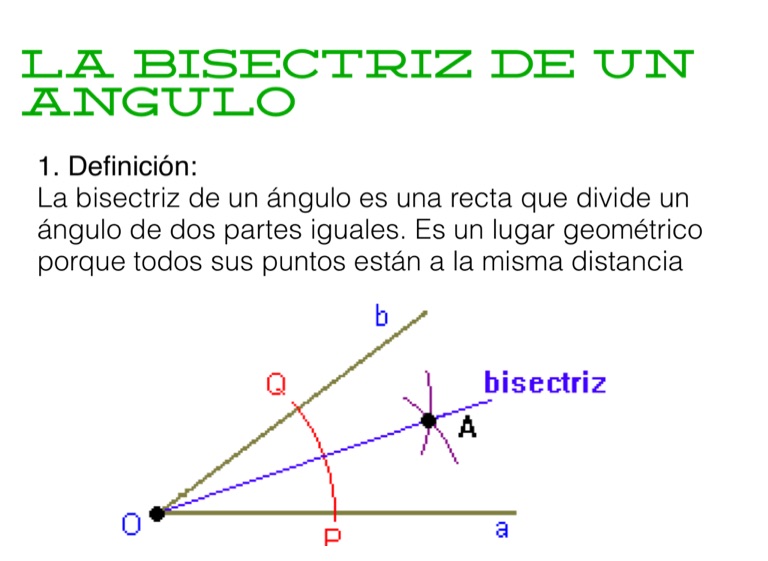 La bisectriz de un ángulo es una recta que divide un ángulo de dos partes iguales. Es un lugar geométrico porque todos sus puntos están a la misma distancia