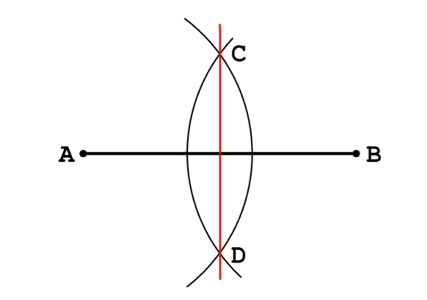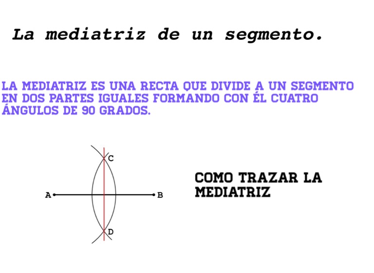 La mediatriz es una recta que divide a un segmento en dos partes iguales formando con él cuatro ángulos de 90 grados.