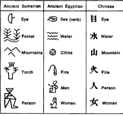 Ideograms- symbols that represent an idea or concept, not specific pronunciations.