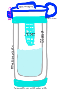 Some features in the Aqua H20 are the BPA free plastic, shatter proof glass, a water filter, a leak proof spout, and a security button for the spout. The bottom of the bottle can be taken out and is dishwasher safe. To fill it, you have a wide opening that is easy to fill.