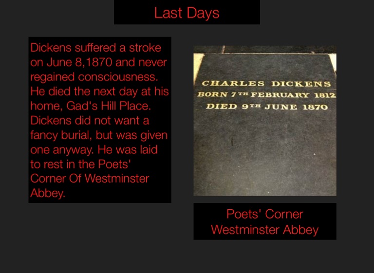 Dickens suffered a stroke on June 8,1870 and never regained consciousness. He died the next day at his home, Gad's Hill Place. Dickens did not want a fancy burial, but was given one anyway. He was laid to rest in the Poets' Corner Of Westminster Abbey.
