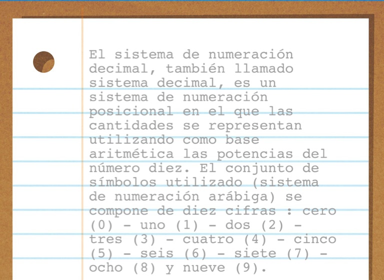 El sistema de numeración decimal, también llamado sistema decimal, es un sistema de numeración posicional en el que las cantidades se representan utilizando como base aritmética las potencias del número diez. El conjunto de símbolos utilizado (sistema de numeración arábiga) se compone de diez cifras : cero (0) - uno (1) - dos (2) - tres (3) - cuatro (4) - cinco (5) - seis (6) - siete (7) - ocho (8) y nueve (9).