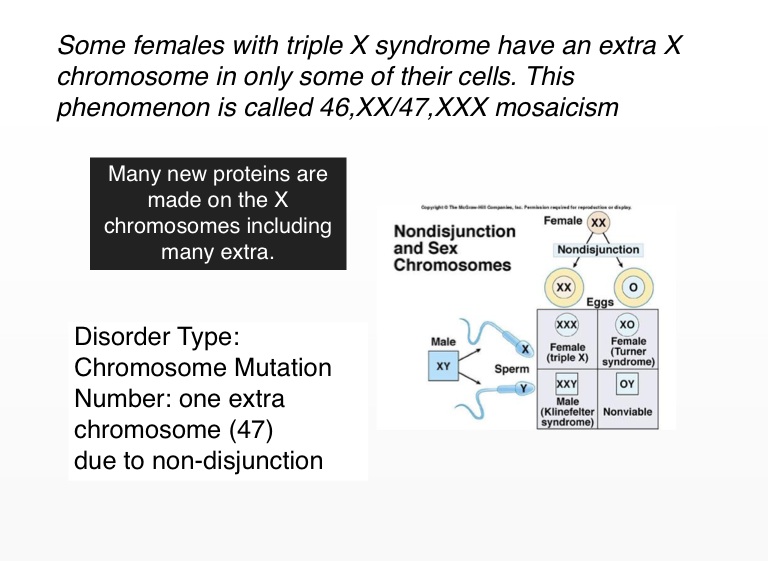 Some females with triple X syndrome have an extra X chromosome in only some of their cells. This phenomenon is called 46,XX/47,XXX mosaicism