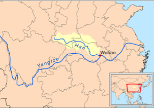 The Han River, also known as HanShui (汉水) or HanJiang (汉江) because of the Chinese pronunciation, is a very important waterway and is a tributary of the Yangtze River. It is located in the regions of Hubei,Shaanxi, and the Qin mountains. It is 1532 km long and has an area of 174 300 square kilometres. Its source is located in Hanzhong and it connects to the Yangtze River. It passes through many provinces including Hanzhong, Ankang, Shiyan, Xiangyang, and Wuhan. It also has a network of canals and is used for transport.The riverbed in the Shenqiong Mountains is more elevated and the rest of the river and the course changes often.
