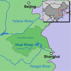 The Huai River or HuaiHe (淮河) was under the control of the Zhou and Shang dynasty. It is located in between the Yellow River and Yangtze River, and is geographically known as the 'dividing line between North and South China'. It is 1078 km long and has an area of 187 000 square kilometres.The Huai River flows from west to east, and passes through the states of Henan, Anhui, and Jiangsu. Its source is from Tongbai Mountain and flows into the Yangtze River.