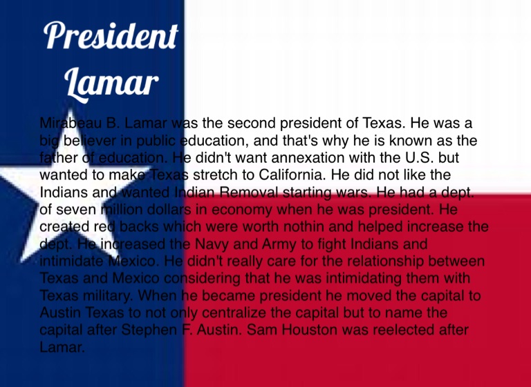 Mirabeau B. Lamar was the second president of Texas. He was a big believer in public education, and that's why he is known as the father of education. He didn't want annexation with the U.S. but wanted to make Texas stretch to California. He did not like the Indians and wanted Indian Removal starting wars. He had a dept. of seven million dollars in economy when he was president. He created red backs which were worth nothin and helped increase the dept. He increased the Navy and Army to fight Indians and intimidate Mexico. He didn't really care for the relationship between Texas and Mexico considering that he was intimidating them with Texas military. When he became president he moved the capital to Austin Texas to not only centralize the capital but to name the capital after Stephen F. Austin. Sam Houston was reelected after Lamar.