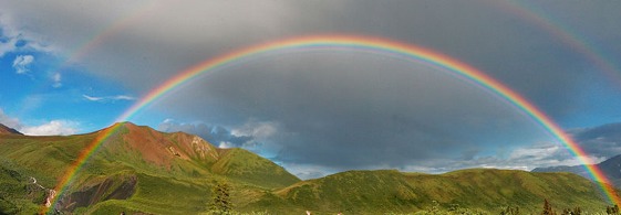 A rainbow is an arch of colours visible in the sky, caused by the refraction and dispersion of the sun's light by rain or other water droplets in the atmosphere.