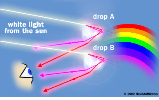 As light enters a water droplet, the different wavelength colors bend at slightly separate angles. Some of this light reflects off the back of the droplet and is bent a second time as the droplet emerges from the light beam. Drops at different angles send distinctively different colors to the eye.