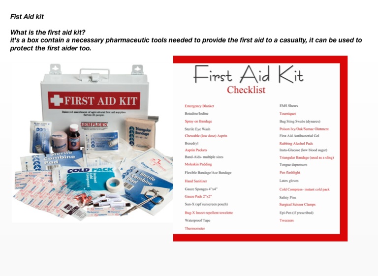 it's a box contain a necessary pharmaceutic tools needed to provide the first aid to a casualty, it can be used to protect the first aider too.