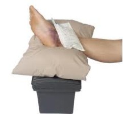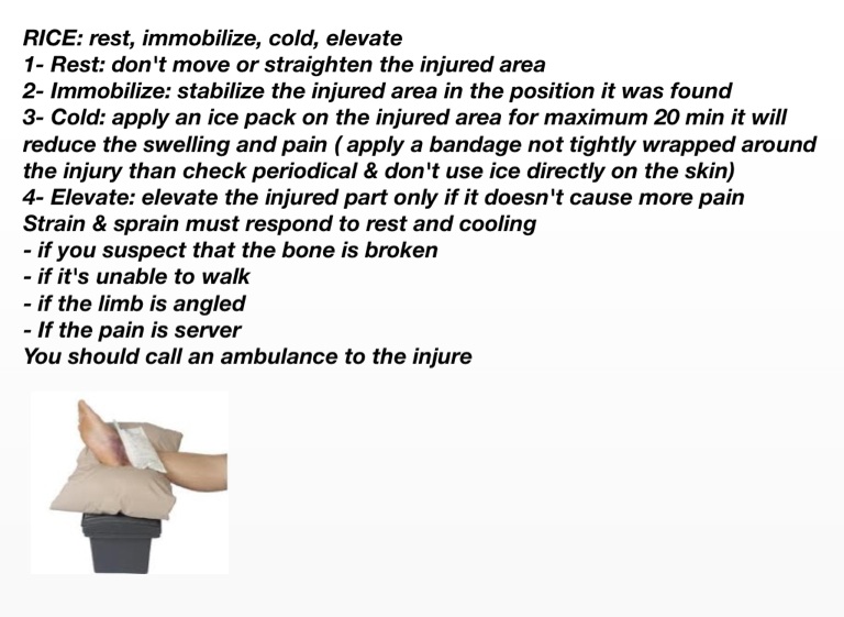 3- Cold: apply an ice pack on the injured area for maximum 20 min it will reduce the swelling and pain ( apply a bandage not tightly wrapped around the injury than check periodical & don't use ice directly on the skin)