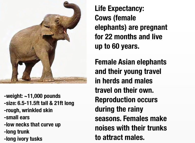 Cows (female elephants) are pregnant for 22 months and live up to 60 years.