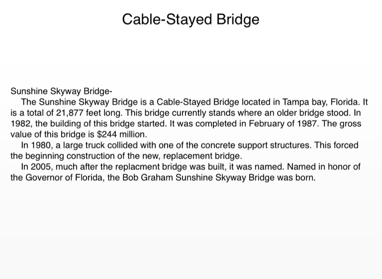The Sunshine Skyway Bridge is a Cable-Stayed Bridge located in Tampa bay, Florida. It is a total of 21,877 feet long. This bridge currently stands where an older bridge stood. In 1982, the building of this bridge started. It was completed in February of 1987. The gross value of this bridge is $244 million.