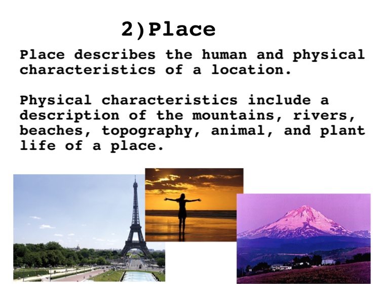 Place describes the human and physical characteristics of a location. Physical characteristics include a description of the mountains, rivers, beaches, topography, animal, and plant life of a place.
