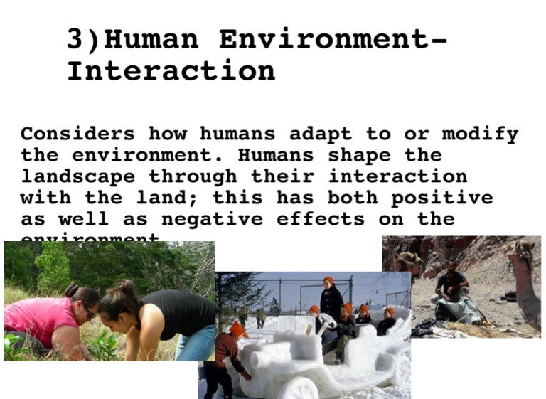 Considers how humans adapt to or modify the environment. Humans shape the landscape through their interaction with the land; this has both positive as well as negative effects on the environment.