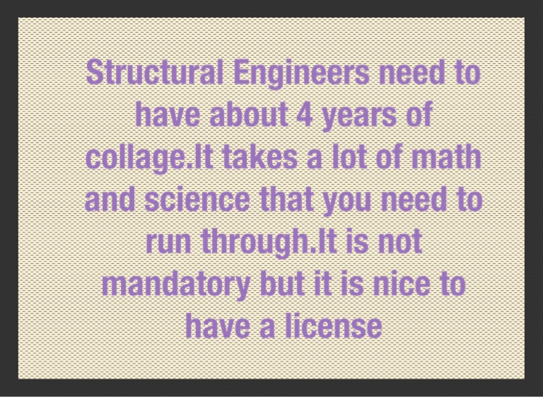 Structural Engineers need to have about 4 years of collage.It takes a lot of math and science that you need to run through.It is not mandatory but it is nice to have a license
