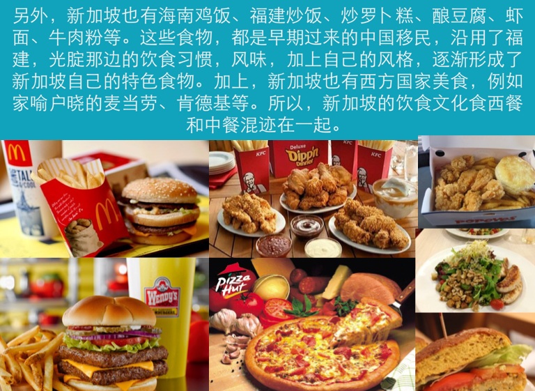 ��,新加坡也有西方国家美食,例如家喻户晓的麦当劳、肯德基等。所以,新加坡的饮食文化食西餐和中餐混迹在一起。