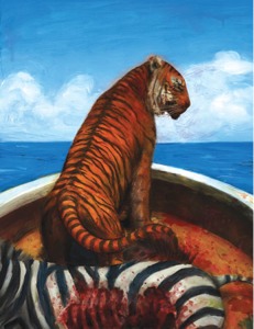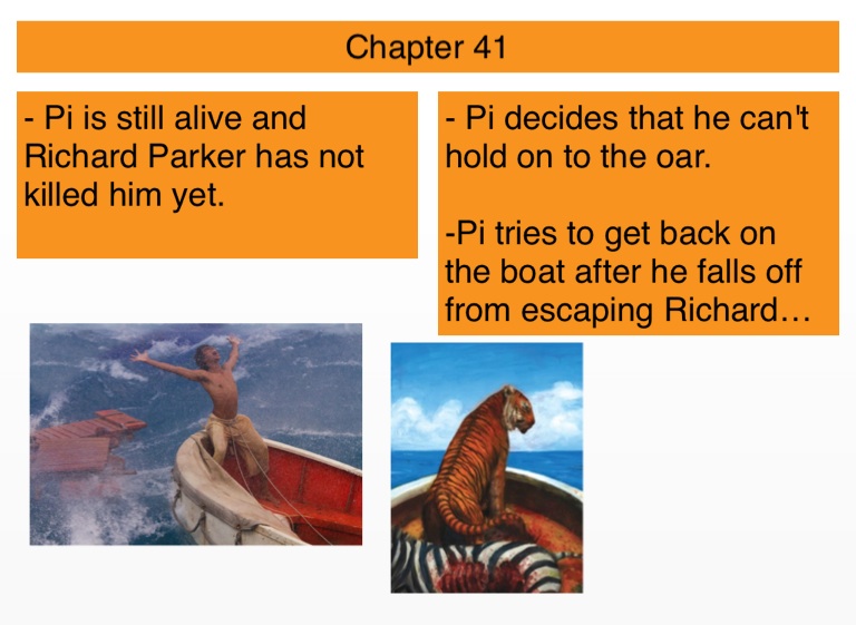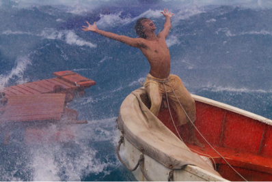 -Pi tries to get back on the boat after he falls off from escaping Richard Parker.