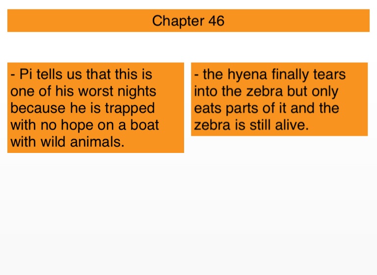 - Pi tells us that this is one of his worst nights because he is trapped with no hope on a boat with wild animals.