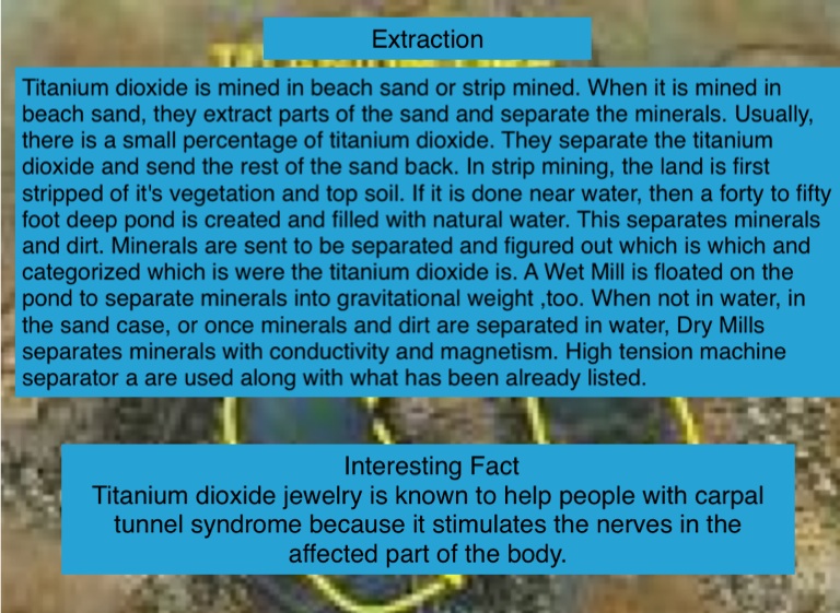 Titanium dioxide is mined in beach sand or strip mined. When it is mined in beach sand, they extract parts of the sand and separate the minerals. Usually, there is a small percentage of titanium dioxide. They separate the titanium dioxide and send the rest of the sand back. In strip mining, the land is first stripped of it's vegetation and top soil. If it is done near water, then a forty to fifty foot deep pond is created and filled with natural water. This separates minerals and dirt. Minerals are sent to be separated and figured out which is which and categorized which is were the titanium dioxide is. A Wet Mill is floated on the pond to separate minerals into gravitational weight ,too. When not in water, in the sand case, or once minerals and dirt are separated in water, Dry Mills separates minerals with conductivity and magnetism. High tension machine separator a are used along with what has been already listed.