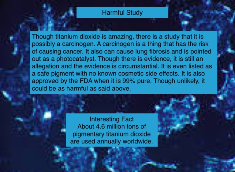 Though titanium dioxide is amazing, there is a study that it is possibly a carcinogen. A carcinogen is a thing that has the risk of causing cancer. It also can cause lung fibrosis and is pointed out as a photocatalyst. Though there is evidence, it is still an allegation and the evidence is circumstantial. It is even listed as a safe pigment with no known cosmetic side effects. It is also approved by the FDA when it is 99% pure. Though unlikely, it could be as harmful as said above.