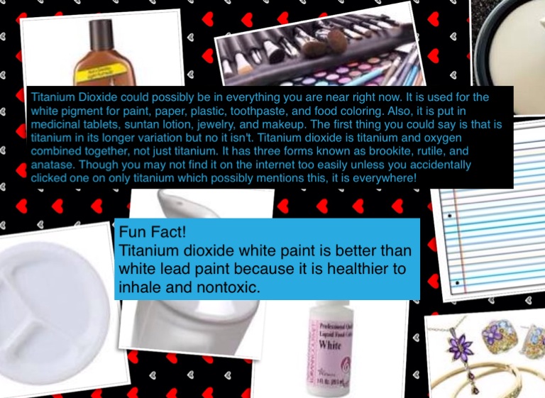 Titanium Dioxide could possibly be in everything you are near right now. It is used for the white pigment for paint, paper, plastic, toothpaste, and food coloring. Also, it is put in medicinal tablets, suntan lotion, jewelry, and makeup. The first thing you could say is that is titanium in its longer variation but no it isn't. Titanium dioxide is titanium and oxygen combined together, not just titanium. It has three forms known as brookite, rutile, and anatase. Though you may not find it on the internet too easily unless you accidentally clicked one on only titanium which possibly mentions this, it is everywhere!