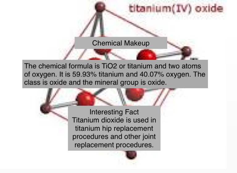 The chemical formula is TiO2 or titanium and two atoms of oxygen. It is 59.93% titanium and 40.07% oxygen. The class is oxide and the mineral group is oxide.