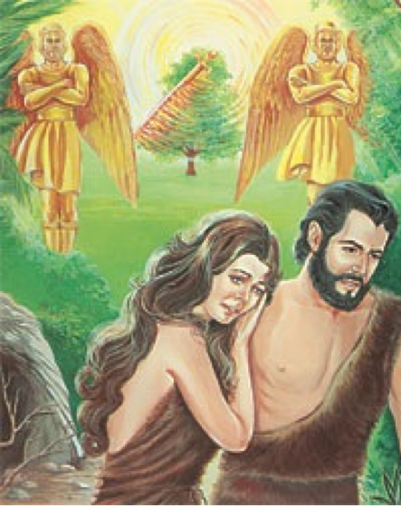 God was sad that Adam and Eve had disobeyed them. He told them that they had to leave the Garden of Eden, "From now on you'll have to scratch a living from the soil. You'll need to make clothes and grow food. Nothing will come easily -- not even childbirth. And one day, you will die."