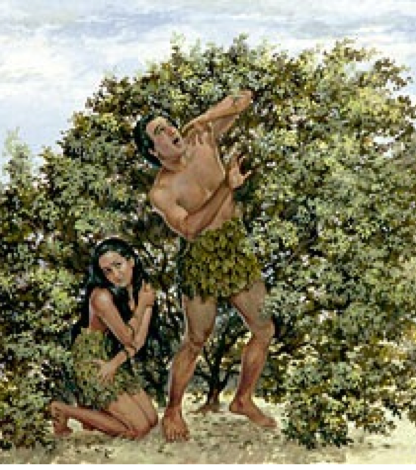 Adam and Eve heard God calling them. Without thinking, they dived into the bushes, but God knew where they were. When God asked them if they had eaten from The Tree of the Knowledge of Good and Evil that He had told them not to touch, they blamed each other for their sins.