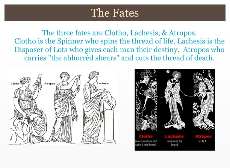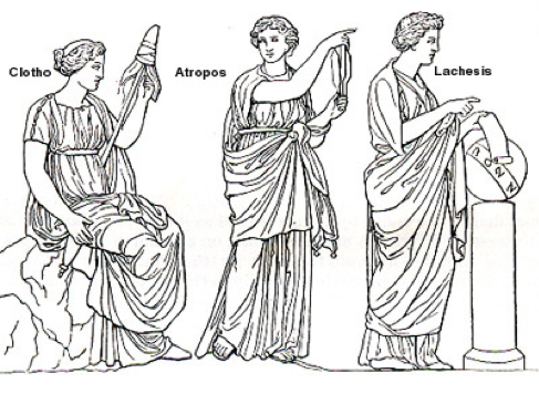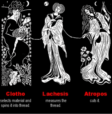 Clotho is the Spinner who spins the thread of life. Lachesis is the Disposer of Lots who gives each man their destiny. Atropos who carries "the abhorréd shears" and cuts the thread of death.