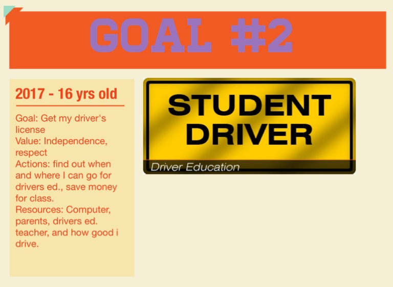 Actions: find out when and where I can go for drivers ed., save money for class.