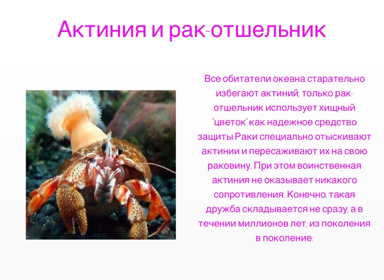 Все обитатели океана старательно избегают актиний, только рак-отшельник использует хищный “цветок” как надежное средство защиты.Раки специально отыскивают актинии и пересаживают их на свою раковину. При этом воинственная актиния не оказывает никакого сопротивления. Конечно, такая дружба складывается не сразу, а в течении миллионов лет, из поколения в поколение.