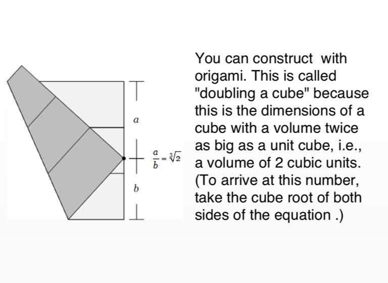 You can construct with origami. This is called "doubling a cube" because this is the dimensions of a cube with a volume twice as big as a unit cube, i.e., a volume of 2 cubic units. (To arrive at this number, take the cube root of both sides of the equation .)