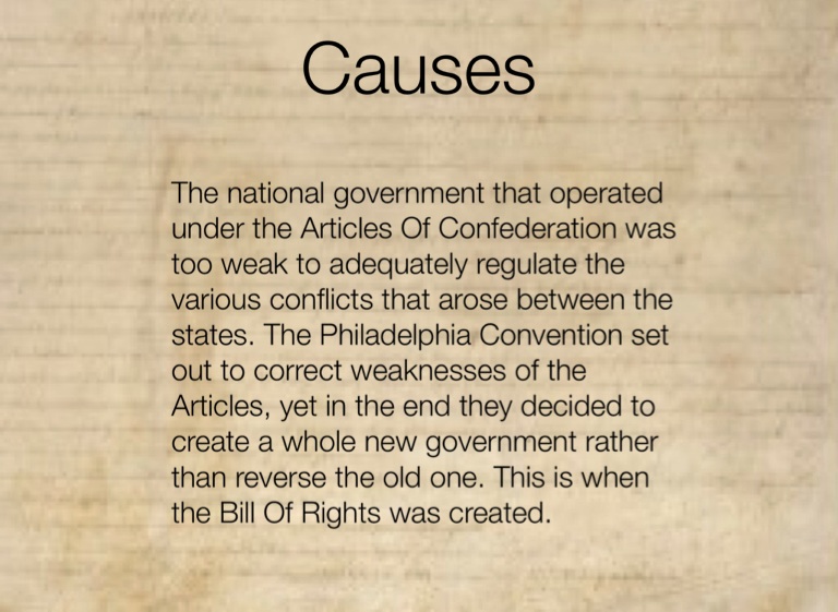 The national government that operated under the Articles Of Confederation was too weak to adequately regulate the various conflicts that arose between the states. The Philadelphia Convention set out to correct weaknesses of the Articles, yet in the end they decided to create a whole new government rather than reverse the old one. This is when the Bill Of Rights was created.