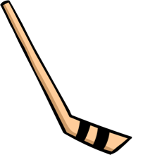Hockey stick, hockey puck, helmet, elbow pads, knee pads and a life jacket