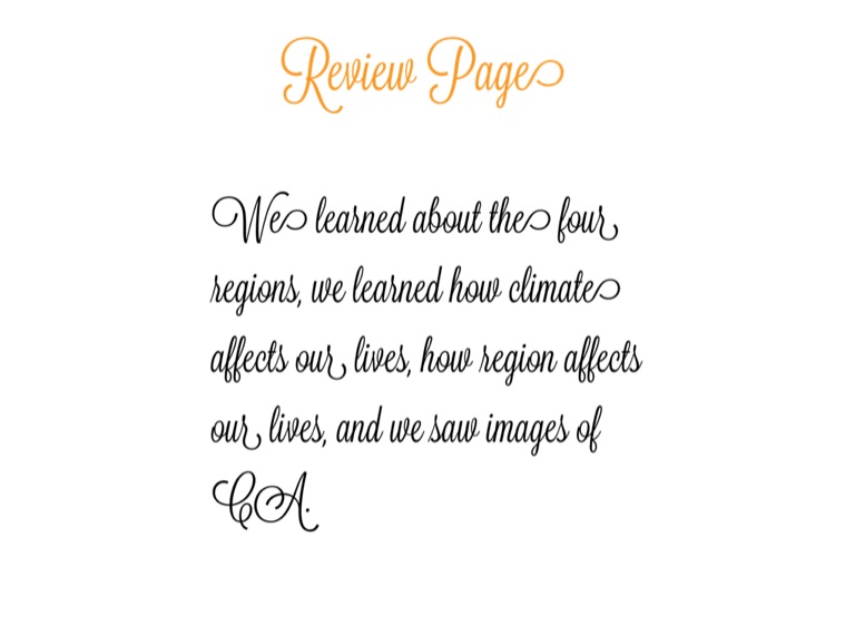 We learned about the four regions, we learned how climate affects our lives, how region affects our lives, and we saw images of CA.