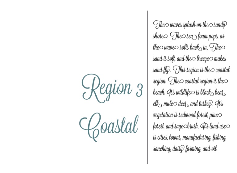 The waves splash on the sandy shore. The sea foam pops, as the wave rolls back in. The sand is soft, and the breeze makes sand fly. This region is the coastal region. The coastal region is the beach. It's wildlife is black bear, elk, mule deer, and turkey. It's vegetation is redwood forest, pine forest, and sagebrush. It's land use is cities, towns, manufacturing, fishing, ranching, dairy farming, and oil.