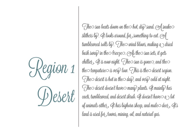 The sun beats down on the hot, dry sand. A snake slithers by. It looks around, for something to eat. A tumbleweed rolls by. The wind blows, making a dried bush sway in the breeze. As the sun sets, it gets chillier. It is now night. The sun is gone, and the the tempature is very low. This is the desert region. The desert is hot in the day, and very cold at night. The desert doesn't have many plants. It mainly has cacti, tumbleweed, and desert shrub. It doesn't have a lot of animals either. It has bighorn sheep, and mule deer. It's land is used for towns, mining, oil, and natural gas.