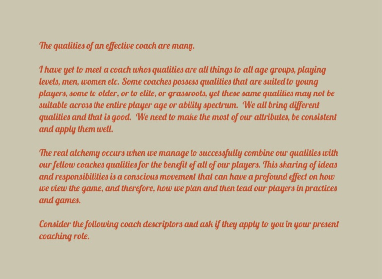I have yet to meet a coach whos qualities are all things to all age groups, playing levels, men, women etc. Some coaches possess qualities that are suited to young players, some to older, or to elite, or grassroots, yet these same qualities may not be suitable across the entire player age or ability spectrum. We all bring different qualities and that is good. We need to make the most of our attributes, be consistent and apply them well.